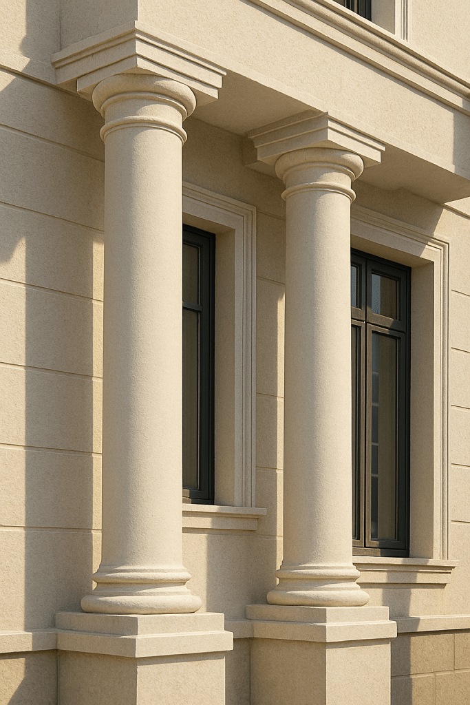 🔸 Hazır sütun elemanları, betonarme, demir ya da ahşap yüzeyler üzerine uygulanarak dış cephenin karakterini belirginleştirir.